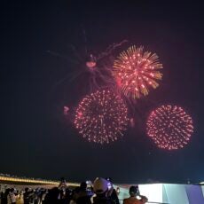 19時台には花火の演出が始まり、建築群や空間全体が一瞬で祝祭空間に変化。
